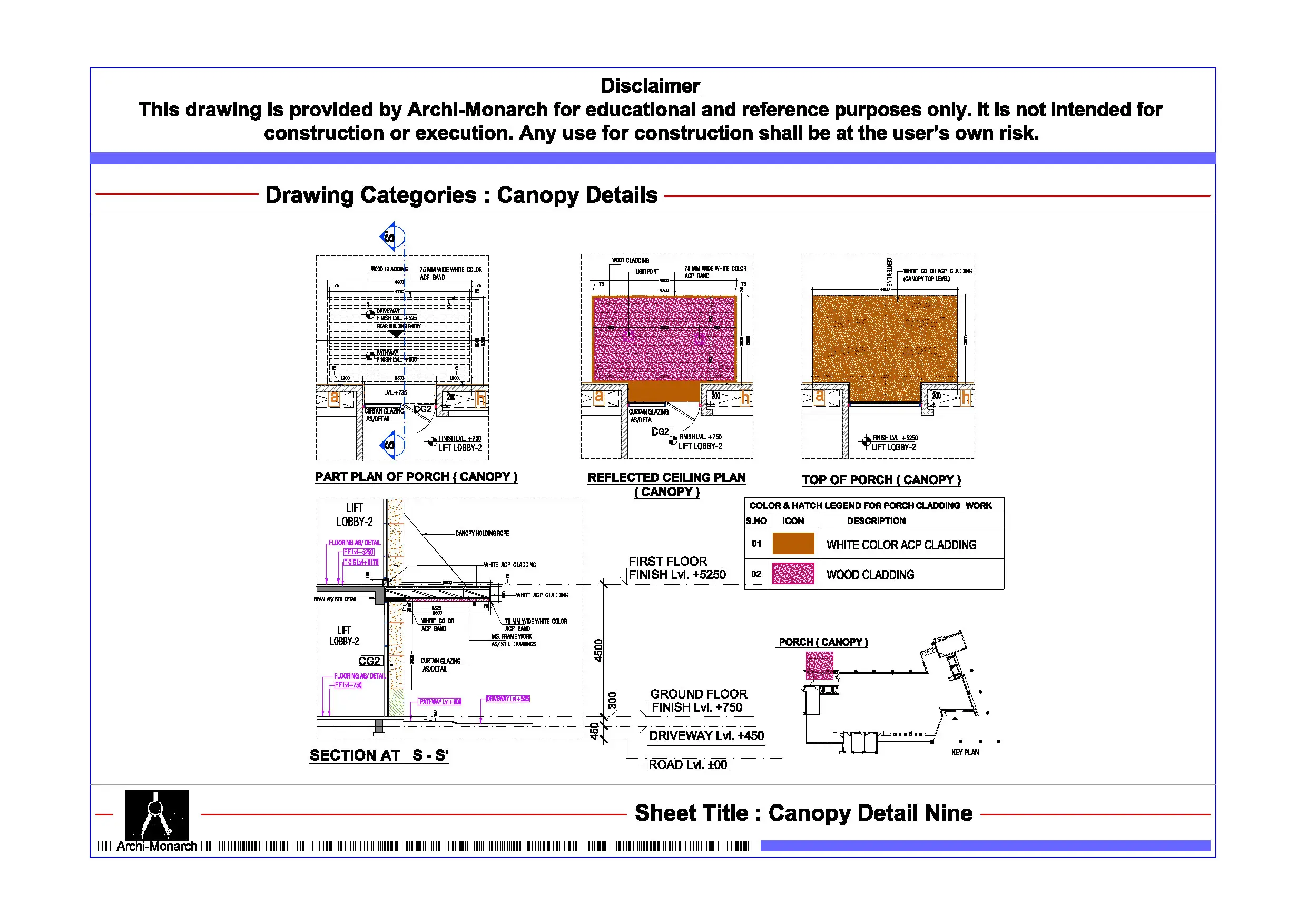 Canopy Detail is an architectural drawing provided in DWG format for educational and reference use only. This digital downloadable file helps architecture students understand canopy design, structural fixing, and construction detailing.