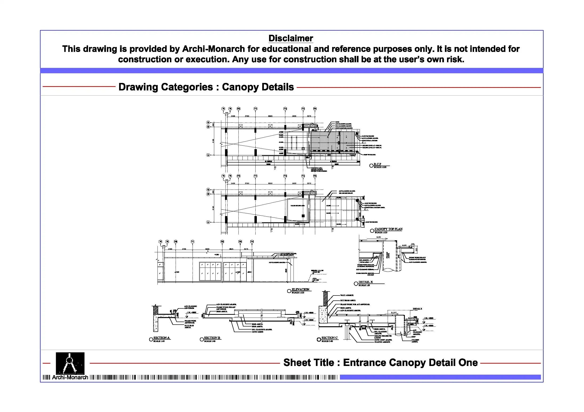 The Entrance Canopy Detail is a professionally prepared architectural drawing provided in DWG format for educational and reference purposes. Entrance canopies enhance building accessibility while also protecting users from weather conditions. Therefore, understanding their architectural detailing and fixing logic is essential for architecture students and early-stage professionals.