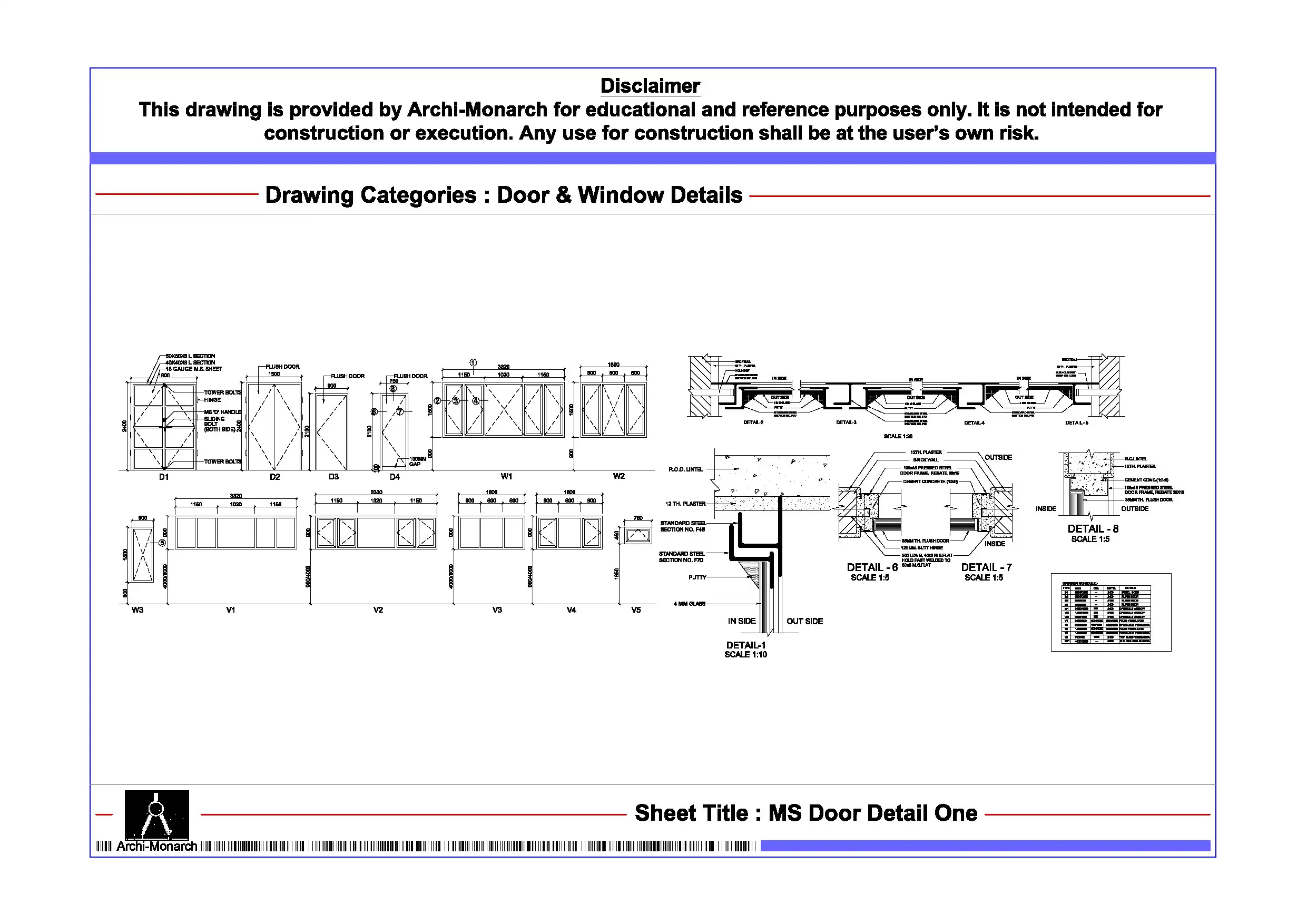 MS Door Detail is an architectural door drawing in DWG format, created for educational and reference use only. This digital CAD file helps learners understand mild steel door construction, frame fixing, and material detailing.