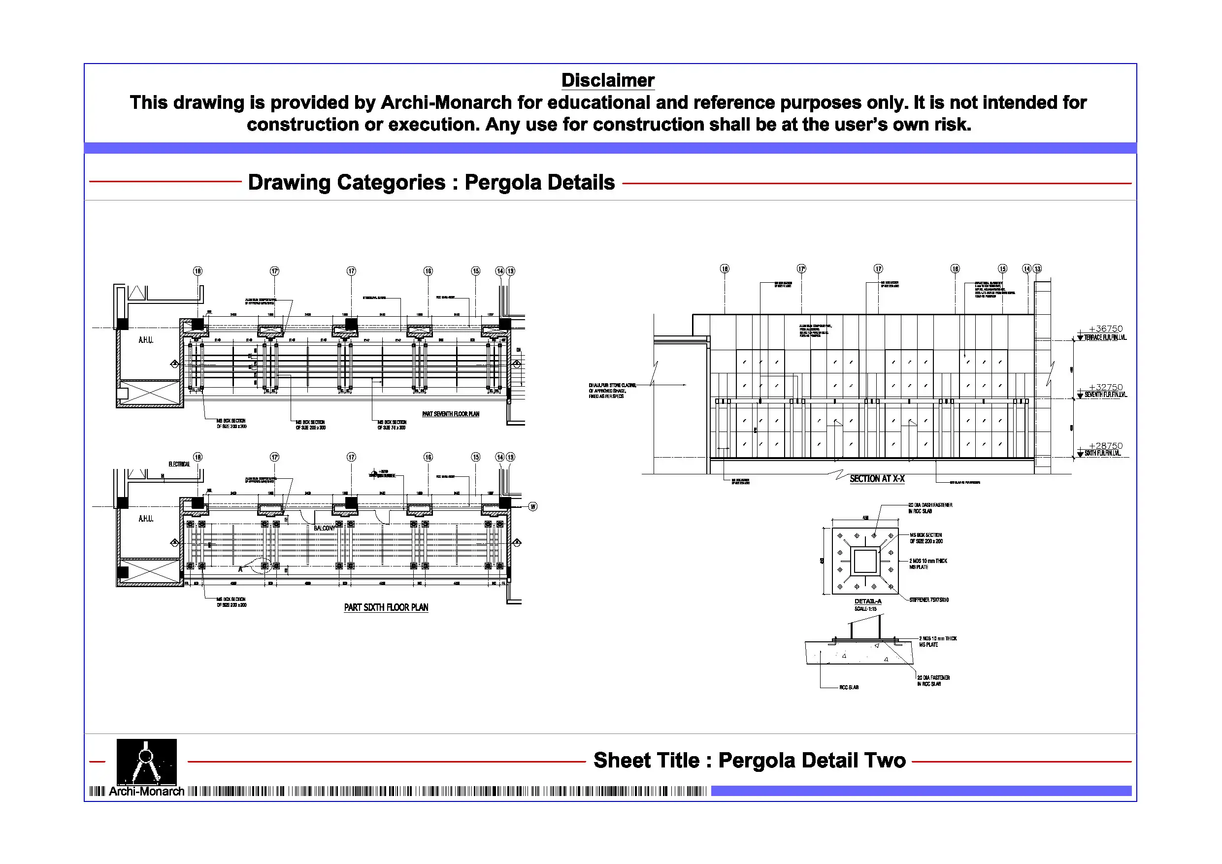 The Pergola Detail is a professionally drafted architectural drawing provided in DWG format for educational and reference purposes. Pergolas serve both functional and aesthetic roles in architectural design by creating shaded outdoor spaces while enhancing visual appeal. Therefore, understanding pergola detailing is important for architecture students and early-career professionals.
