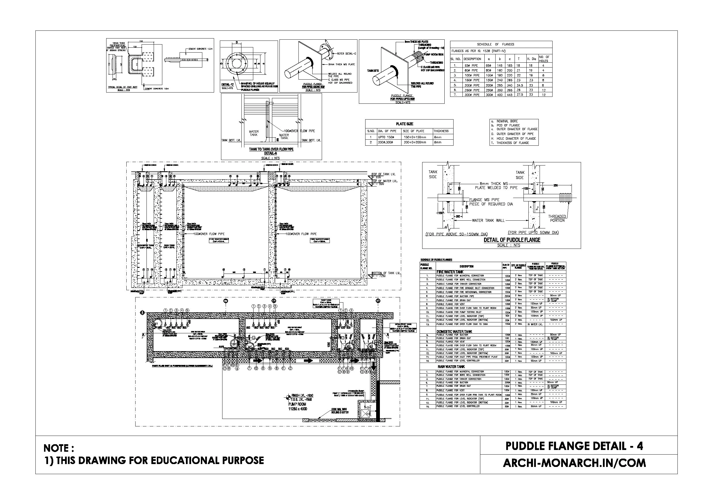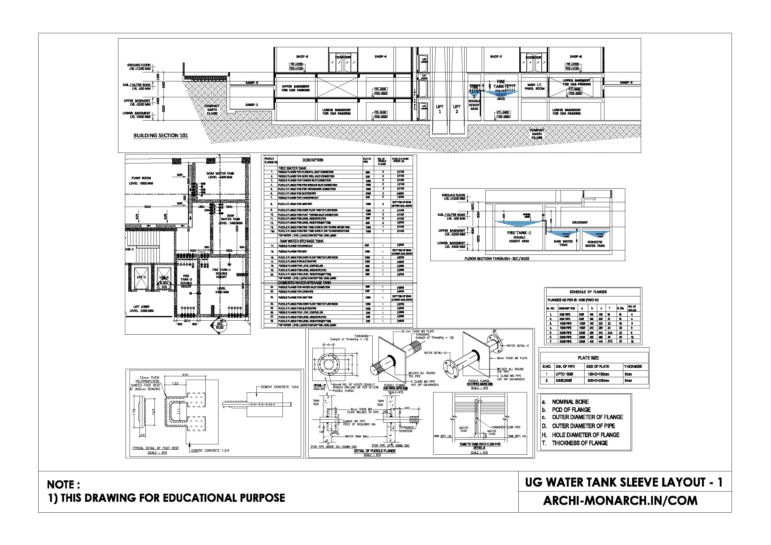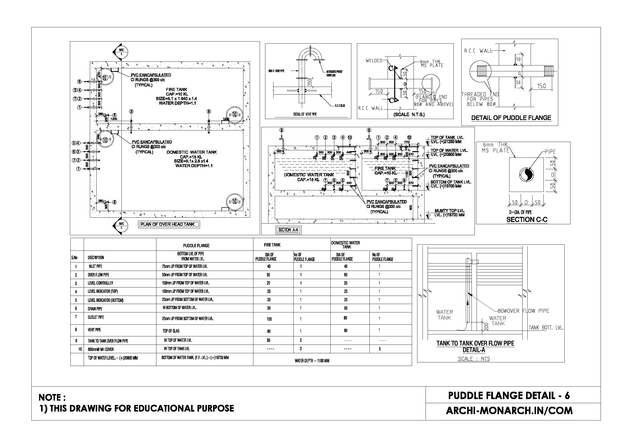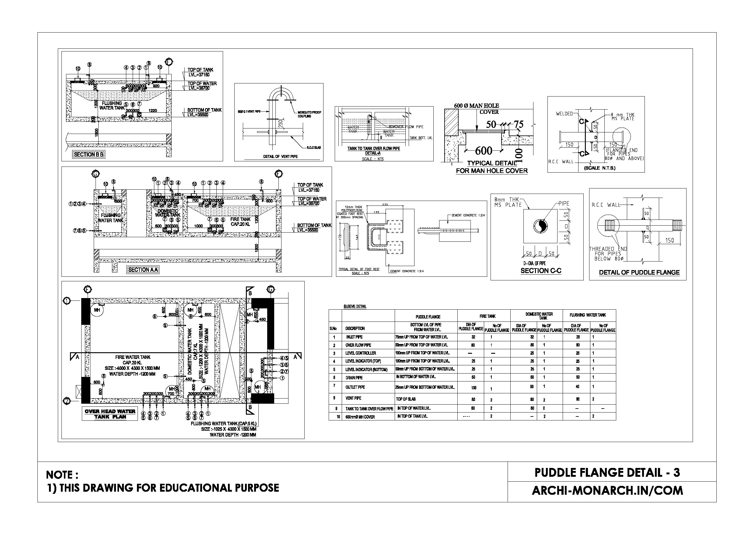 Architectural water tank detail drawings are technical drawings that provide specific information about the design and construction of a water tank. These drawings typically include information such as the tank’s capacity, material specifications, dimensions, and location in the building.