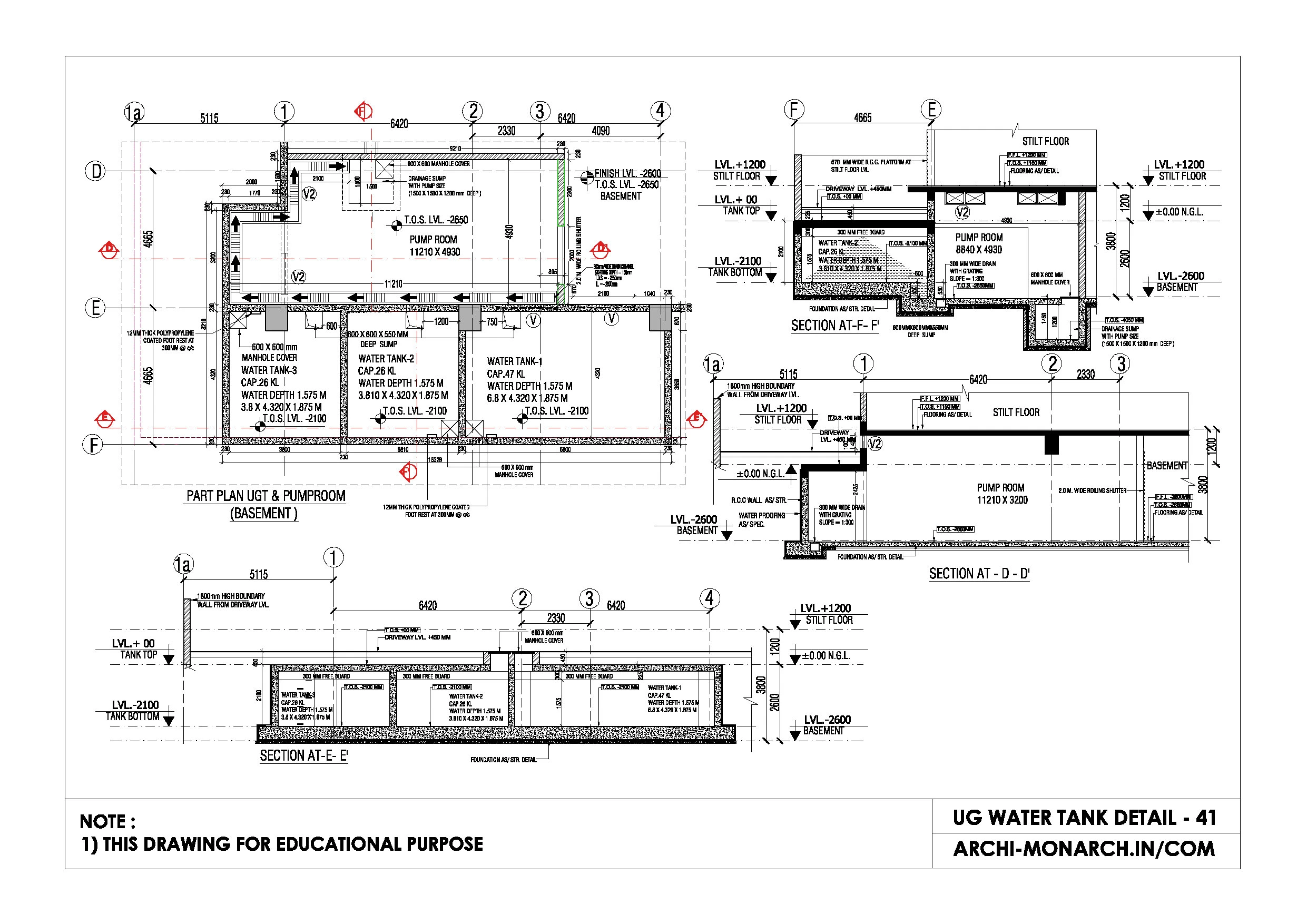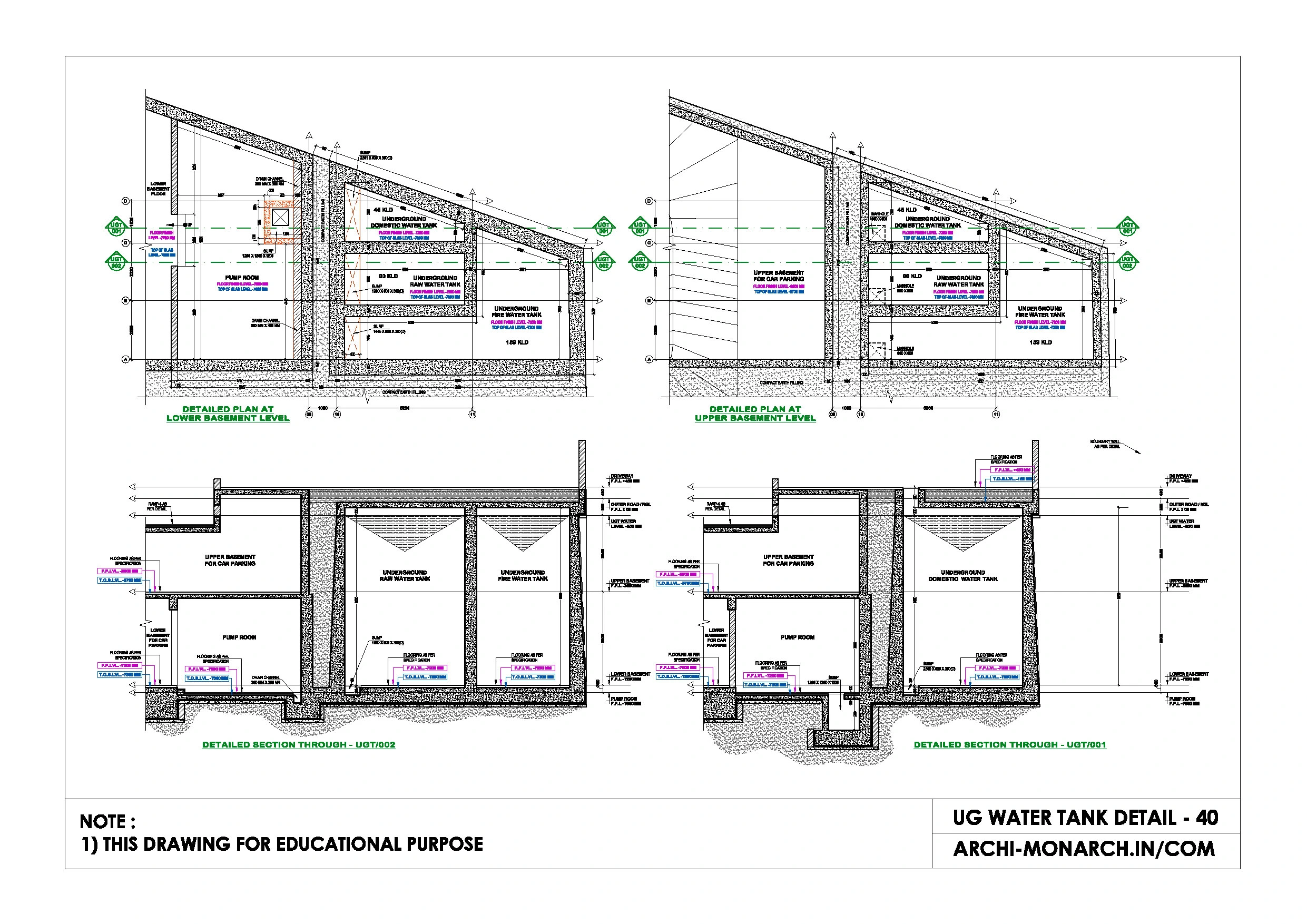 These drawings are typically created by architects or engineers and are used by builders and contractors during the construction process to ensure that the water tank is built according to the plans and specifications.